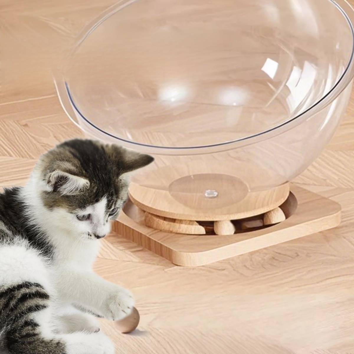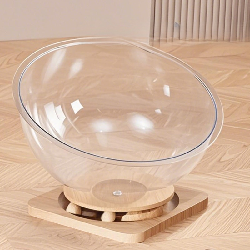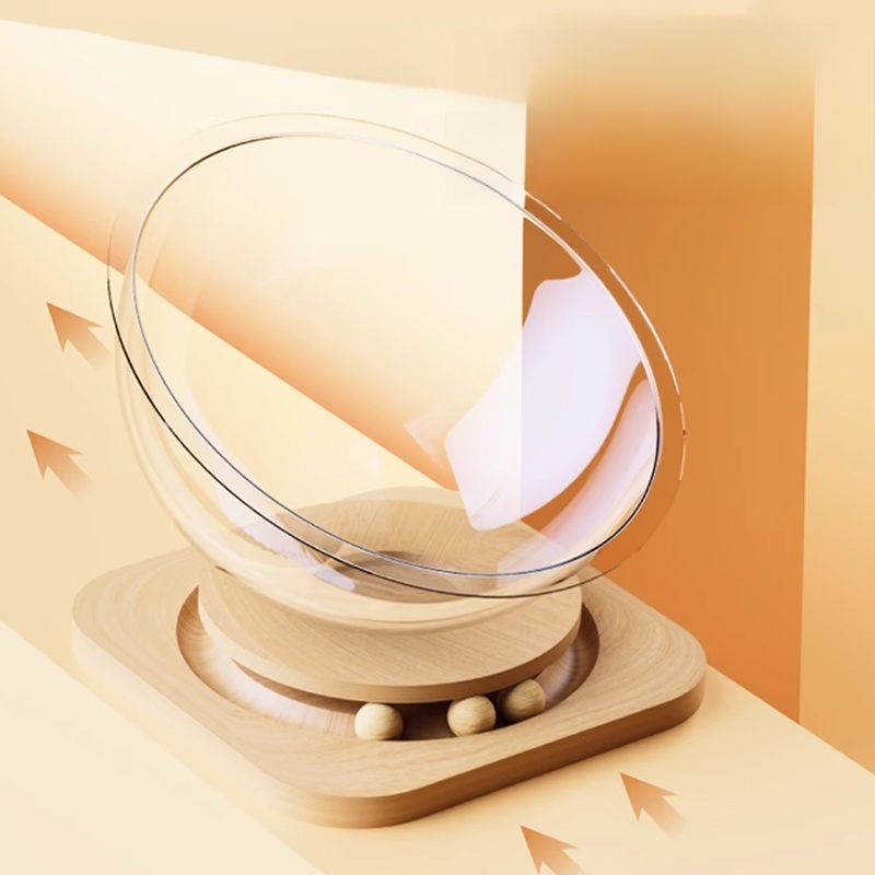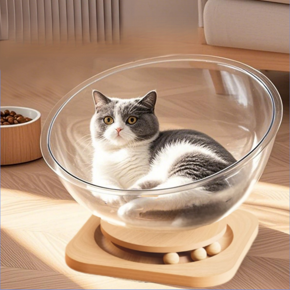 Transparent Space Capsule Cat Nest with Trackball Toys and Solid Wood Base, Pet Bed